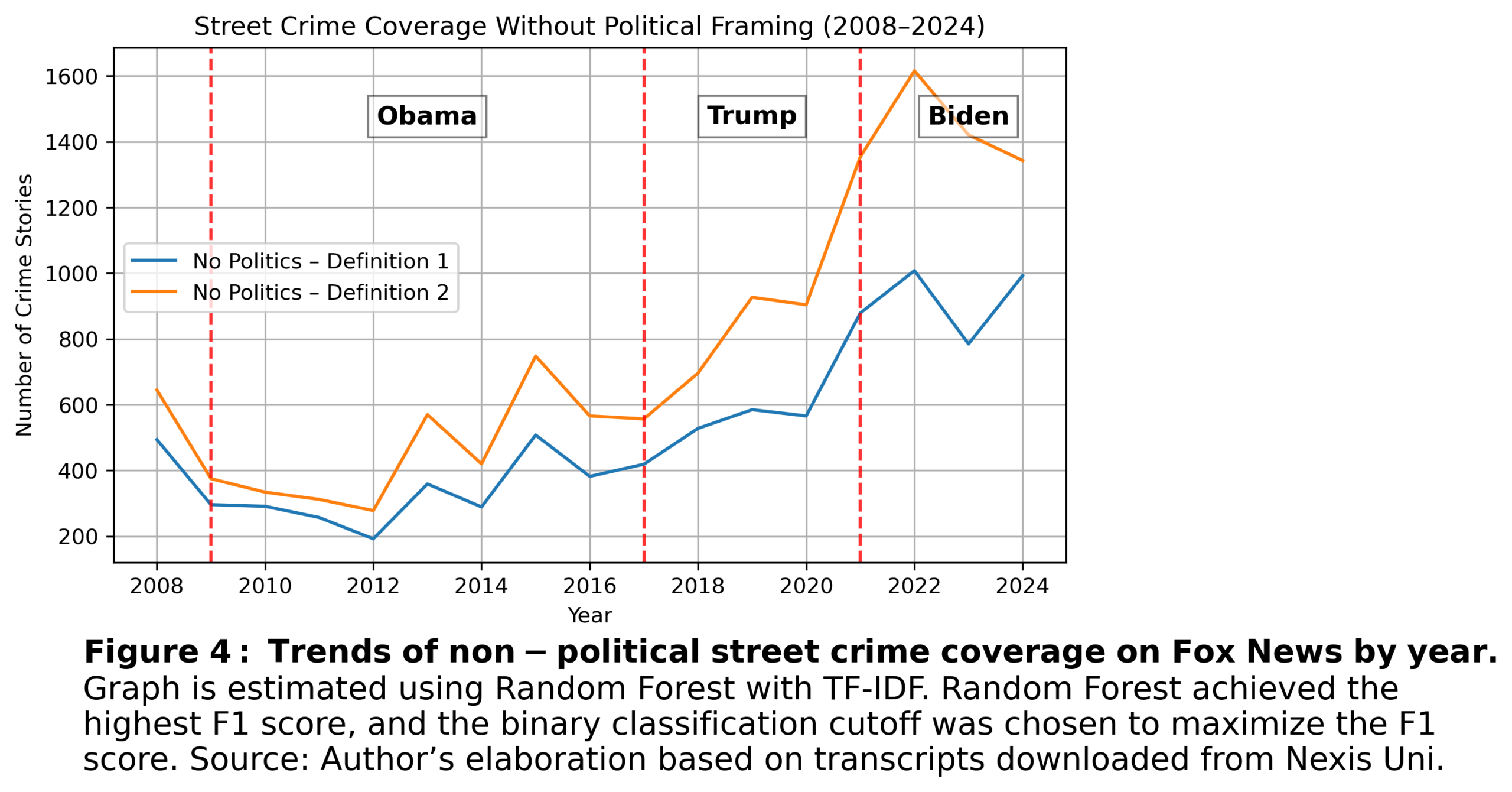 The magnitude of the increase varies depending on the definition used. Under Definition 1, I classify a story as crime-related only if it excludes stories that exclusively discuss “Trump,” “Biden,” or crimes involving Democrats (“Democrat Crime”). Under Definition 2, I further exclude stories that primarily criticize liberal policies (“Democratic Policies”). Both definitions are valid. Critiques of liberal policies often reference very real crime events, but these events are embedded in political commentary. In other words, the crime itself is real, but the emphasis is placed on criticizing the policies associated with it.