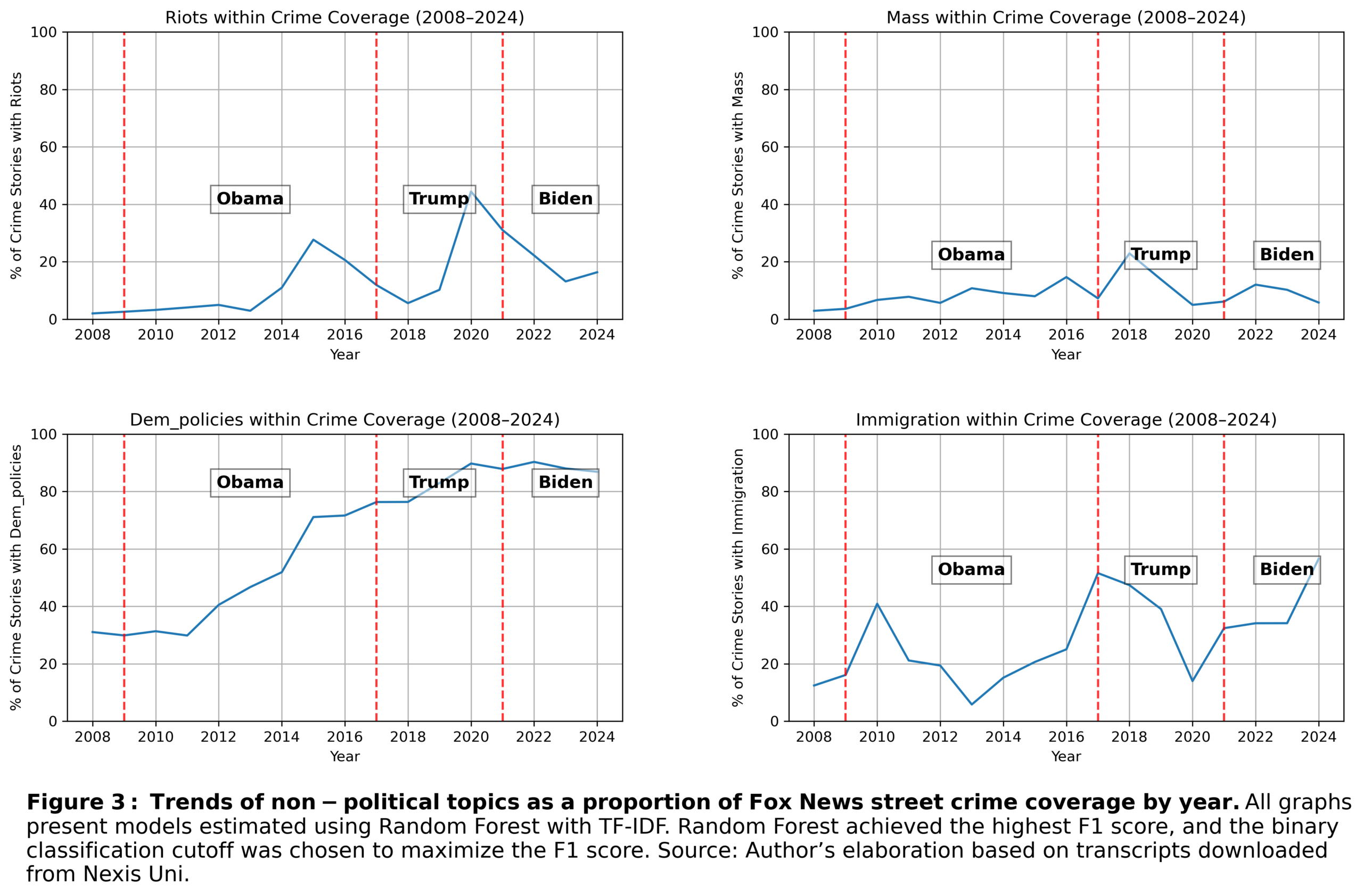 I collected broadcast news transcripts from Nexis Uni for three major cable networks (Fox News, CNN, MSNBC). My sample covered the period from 2008 and 2024 and included either the word “crime” or a broad set of “crime-related” keywords (and excluded “crime”). Because crime-related keywords are often used metaphorically, especially the use of“crime-related” keywords, this brings noise into the dataset, bringing the need for machine text classification.
